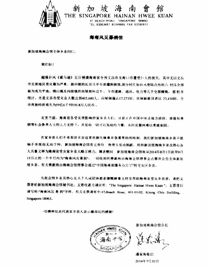 新加坡海南乡亲及热心友人个人或团体愿意慷慨解囊支持及帮助海南省受灾乡亲者,请把支票寄给新加坡海南会馆秘书处。