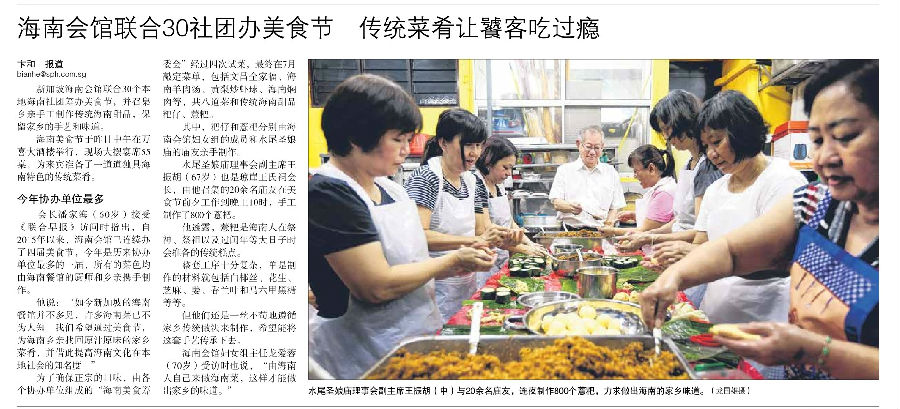 新加坡海南会馆联合30个本地海南社团筹办美食节,并召集乡亲手工制作传统海南甜品,保留家乡的手艺和味道。海南美食节于9月23日在万喜大酒楼举行,现场大摆宴席55桌,为来宾准备了一道道独具海南特色的传统菜肴。