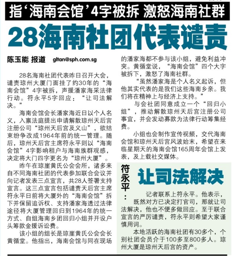 28海南社团代表谴责天后宫主席符永平将大厦“海南会馆”四大字拆下
