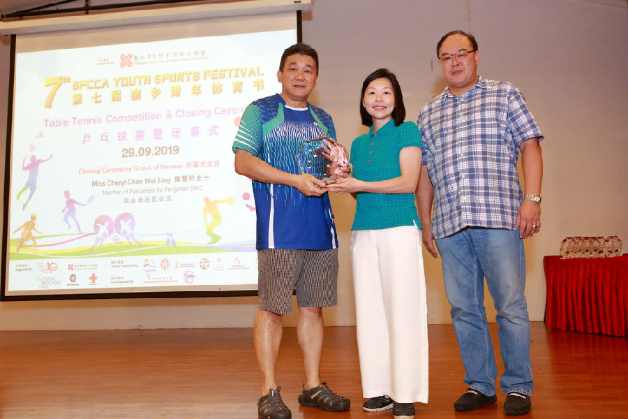 第七届宗乡青年体育节已圆满落幕!当天举办了乒乓比赛,由新加坡海南会馆的海南少年红队夺冠。很荣幸地邀请到凤山单选区议员陈慧玲女士前来主持闭幕式暨颁奖礼;除了颁发奖牌与奖牌给各赛事的得奖者,也颁发纪念奖座予联办、协办的会馆及支持单位。